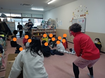 お話を聞いた後は体を動かしましょう! ゲーム大会です! ☆ ○×クイズ スタッフのどちらがまばたきが早いかなどのスタッフクイズは悩みぬいて答えを出す様子が^^ ☆ 巻き巻きリレー 毛糸を最後まで巻き取って次の人へバトンタッチ! 毛糸が切れるハプニングもありましたが、これもいいスパイスに♪ 追いつくためにスピードアップ! ☆ 追いかけ玉入れ スタッフが被ったトナカイの中にどれくらい新聞紙の球を入れる […]